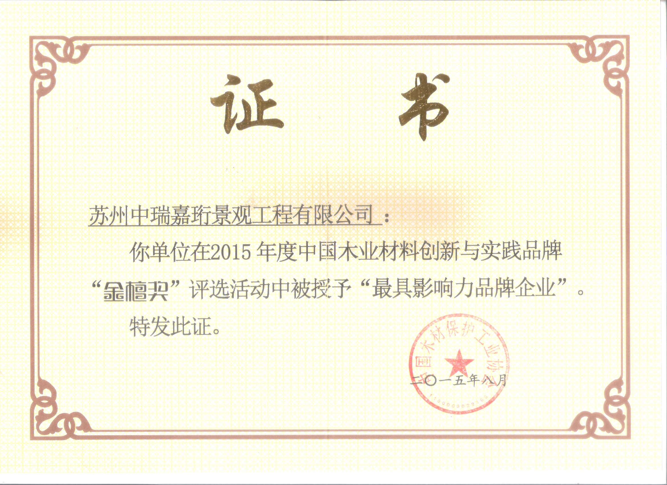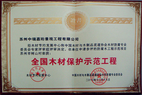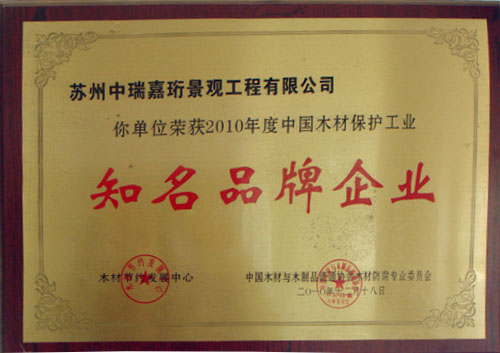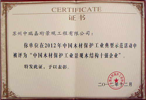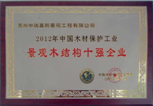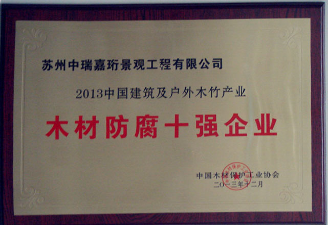 2013年在《中國木材保護(hù)工業(yè)協(xié)會》的組織下,我公司榮獲本年度防腐木企業(yè)評選《防腐木材企業(yè)十強(qiáng)》稱號。